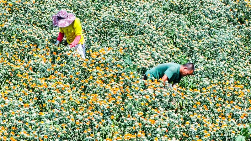 在裕民县红花种植基地,药农正在采收红花正值盛夏,裕民县的红花迎来丰收。今年,裕民县红花种植面积达到十五万亩,产量和品质均创历史新高,为当地农民带来了可观的经济效益。裕民县江格斯乡塔斯特布拉克村种植户黑生军说,他今年种植了300亩红花,长势好、产量高,预计每亩可收获红花籽100公斤,亩均利润可达到500元左右。红花是一种多用途植物,具有药用、油料、色素提取和饲料等及经济价值。新奇康药业股份有限公司抓住这一机遇,与裕民县政府合作,建立了红花种植基地,通过科学管理和标准化种植,提高了红花的产量和品质。公司还加大了对红花的科技研发力度,开发出了一系列以红花为原料的药品和保健品,满足市场需求。新奇康药业股份有限公司董事长陈金成说,公司通过订单式种植,可以帮助农民每年以25%的增量增加收入。