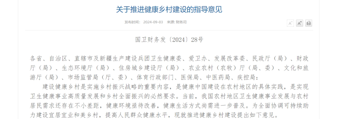 指导意见提出,到2030年,乡村健康服务能力大幅提升,居民能够便捷获得优质的医疗卫生服务,个人医疗卫生负担可承受;健康生活方式得到普及,重大疾病危害和主要健康危险因素得到有效控制,居民健康水平持续提升。到2035年,建成健康乡村,基本公共卫生服务均等化水平明显提高,城乡卫生健康事业发展差距和居民健康水平差距显著缩小。