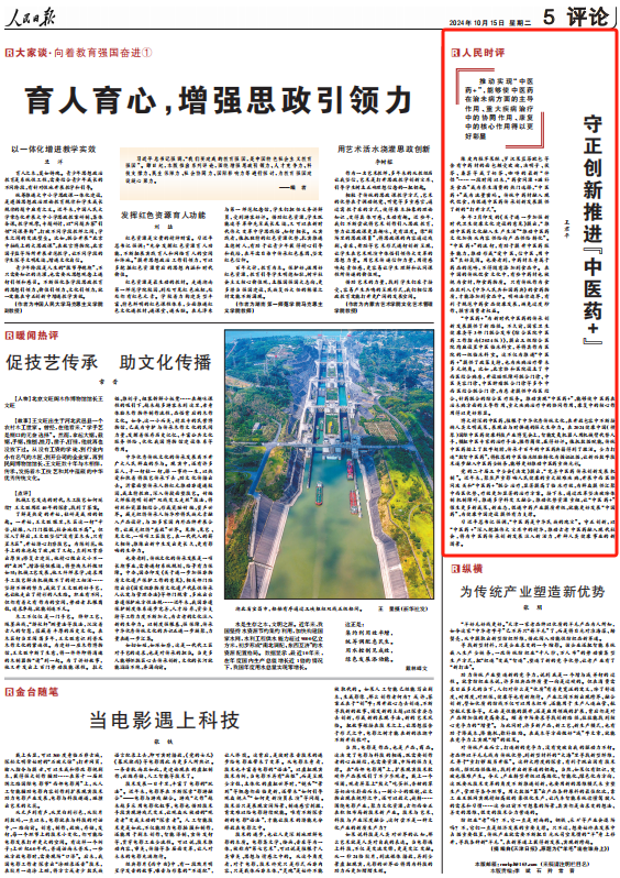 推动实现“中医药+”,能够使中医药在治未病方面的主导作用、重大疾病治疗中的协同作用、康复中的核心作用得以更好彰显——陈皮肉桂苹果酥、罗汉果蓝莓欧包等含有中药材的面包颇受欢迎,决明子、茯苓、桑葚等成了奶茶、咖啡的最新“伴侣”……一段时间以来,“药食同源+滋补类食品”成为养生消费的热门选择,“中医药+”成为流量密码。传统中药材融入现代饮食,为促进中医药传承创新发展提供了新的“打开方式”。今年2月印发的《关于进一步加强新时代卫生健康文化建设的意见》提出,“推动中医药文化融入生产生活”“推动中医药文化加快从内容供给向产品供给转化”。“中医药+”的流行,有助于提升中医药服务能力,推动形成“爱中医、信中医、用中医”良好氛围。也要看到,中药材本身属于药品的范畴,不得随意添加到食品中。在中国的传统饮食文化中,有些中药材也被视为食材,即食药物质。只有传统作为食品且列入《中华人民共和国药典》的食药物质,才能添加到食品中。明确法律边界,有利于规范中药食品健康发展,避免过度炒作、损害消费者权益。“中医药+”为新时代中医药的传承创新发展提供了新路径。不久前,国家卫生健康委等3部门联合发布《综合医院中医药工作指南(2024版)》,提出三级综合医院均应设置中医临床科室,并将其作为医院的一级临床科室。这不仅为推进“中医药+”提供了政策支持,也为疾病治疗带来多元视角。比如,北京协和医院设立了中西医结合病房,开设睡眠障碍联合门诊、中医美容门诊、中医肿瘤联合门诊等多个中西医结合联合门诊,为患者提供中西医结合、针药联合的综合医疗服务。推动实现“中医药+”,能够使中医药在治未病方面的主导作用、重大疾病治疗中的协同作用、康复中的核心作用得以更好彰显。博大精深的中医药,植根于中华优秀传统文化,在开放包容中不断接纳人类文明成果,展现出与时俱进的强大生命力。在2024健康中国(横琴)国际中医药健康科技产业博览会上,智能艾灸机器人用机械臂代替人手,模拟中医专家的治疗手法,操作简便,赢得好评。依托数据赋能,传统中医药插上了数字翅膀,传承千百年的中医药典籍得到了激活。全力打造“数智中医药”,将散落的中医临床经验转化为循证证据,让新兴数字技术逐步融入中医药全链条,能够更好推动中医药重焕光彩。党的二十届三中全会《决定》提出,“完善中医药传承创新发展机制”。近年来,聚焦严重影响人民健康的重大疑难疾病,开展中西医协同攻关和“中医药+”联合治疗,显著提高了临床疗效,为群众提供汇聚中西医优势、疗效更加显著的治疗方案。接下来,通过改革坚决破除体制机制障碍,推进多学科交叉融合,推动优势资源重组,让“中医药+”催生更多新成果、新业态,促进中药产业提质升级,就能更好发展“中国药”,为健康中国建设提供有力支撑。习近平总书记强调,“中医药是中华民族的瑰宝”。守正创新,以“中医药+”深入挖掘伟大宝库中的精华,推动古老中医药融入现代社会,将为中医药传承创新发展注入新活力,开辟人类健康事业的新图景。